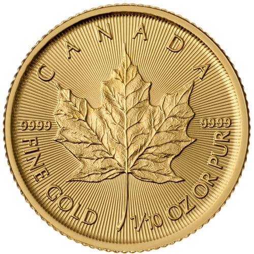 The Canadian Gold Maple Leaf is Canada’s official gold bullion specimen. A legal tender coin with face value in Canadian Dollars, the Government of Canada backs the purity and face value of each coin released by the Royal Canadian Mint. The 1/10 oz Canadian Gold Maple Leaf Coin is one of the smallest in the series and is now available.