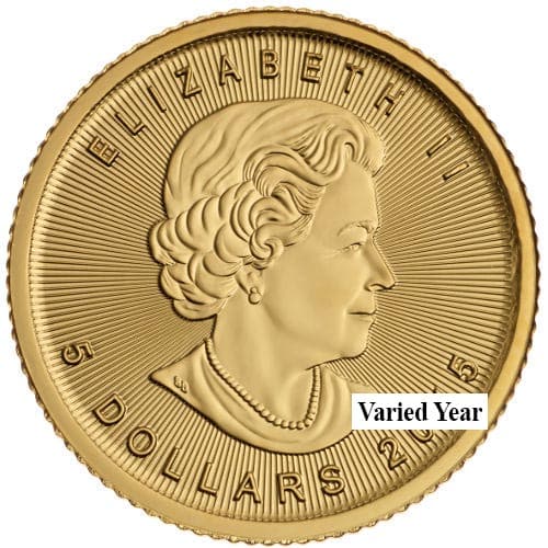 On the obverse of all 1/10 oz Canadian Gold Maple Leaf Coins you’ll find an effigy of Queen Elizabeth II. Depending upon year of issue, the right-profile portrait of Queen Elizabeth II varies. From 1979’s introduction until 1989, a portrait of the Queen from Arnold Machin dominated the design. That was replaced from 1990 to 2003 by Dora de Pedery-Hunt’s depiction. Today, coins from 2004 onward have Susanna Blunt’s design.